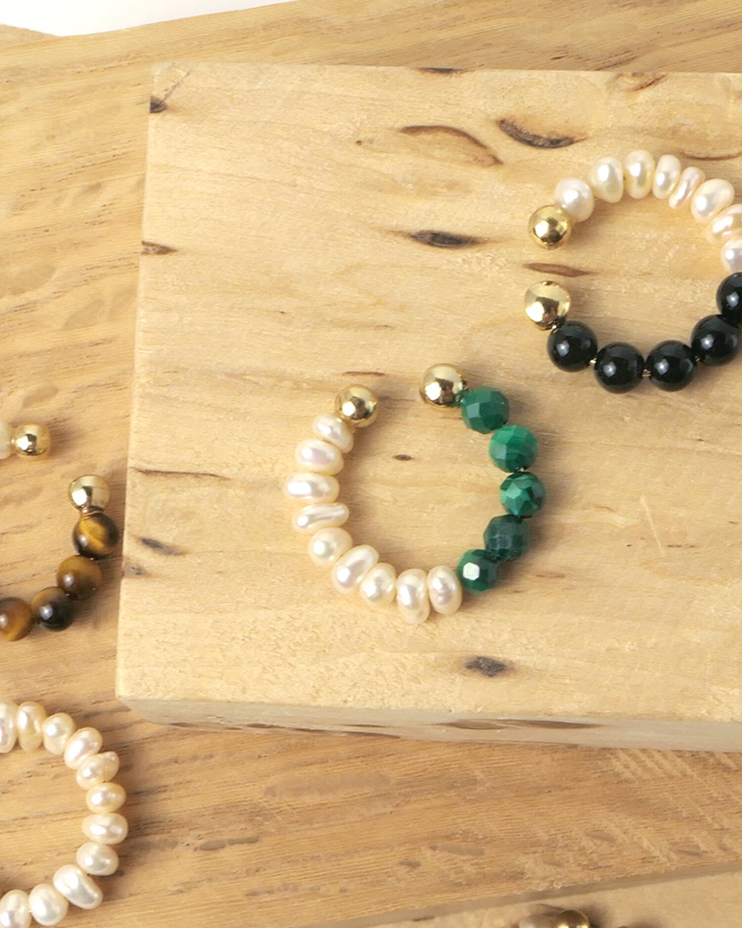 形状や大きさが1つ1つ異なるケシパールと、深いグリーンの天然石「マラカイト」を組み合わせました。