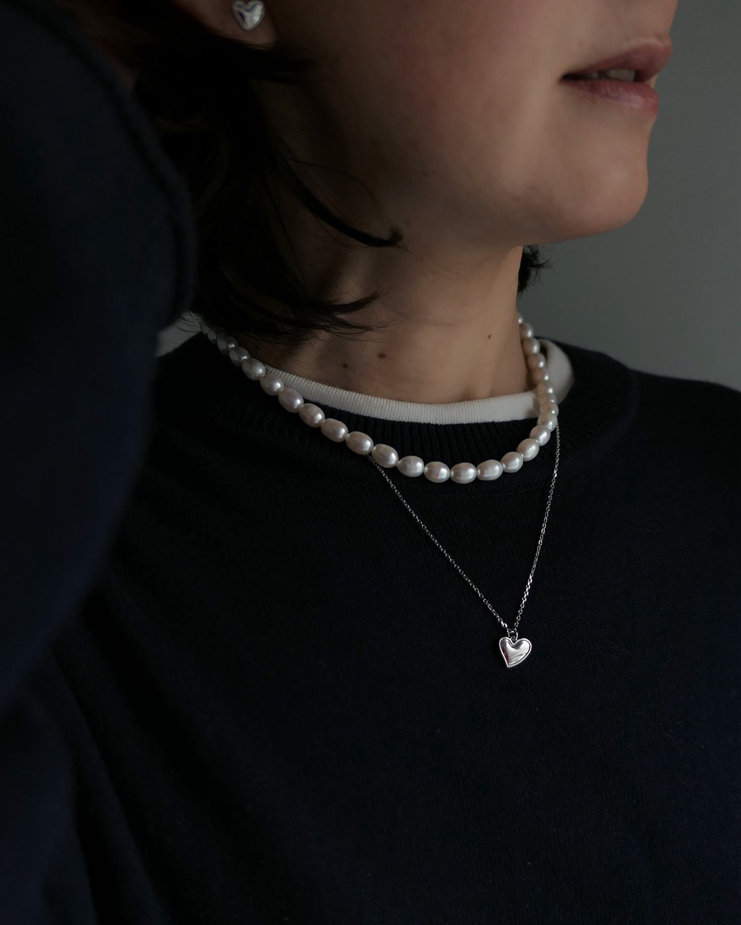 ボリュームチェーンやパールネックレスとの組み合わせもおすすめです。