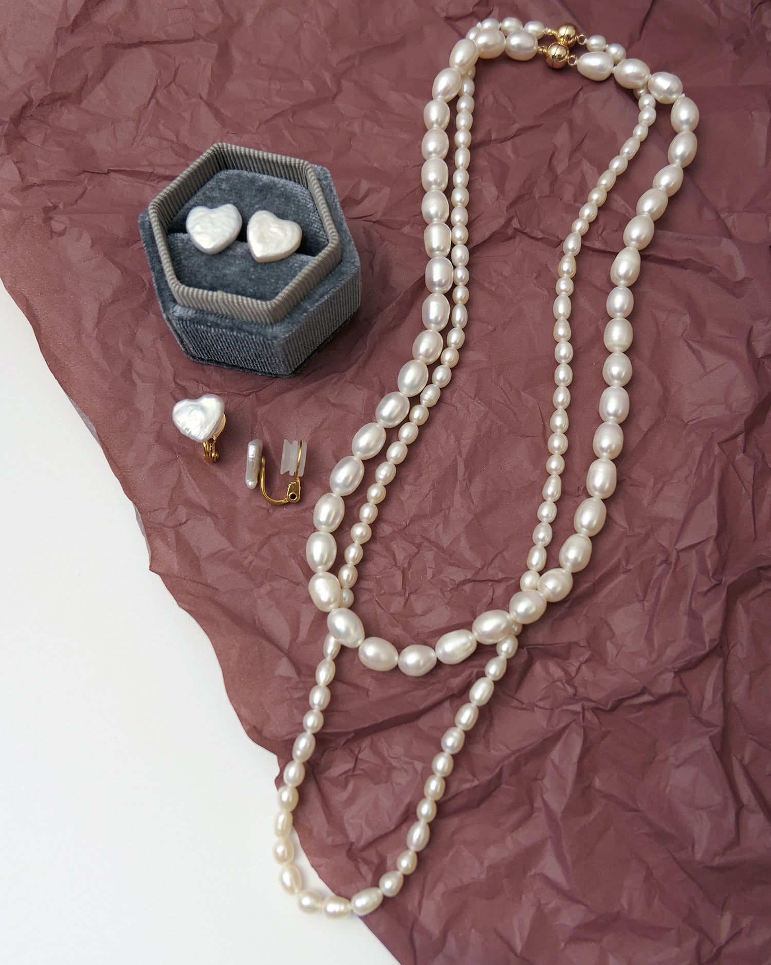 異なる表情のパールを組み合わせたデザイン。