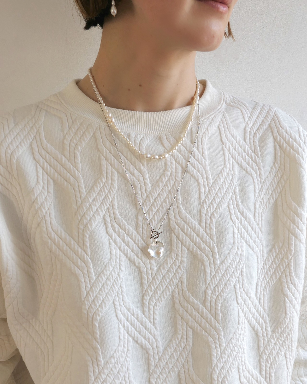 アシンメトリーに、コロンと大きめパールを配置したネックレス